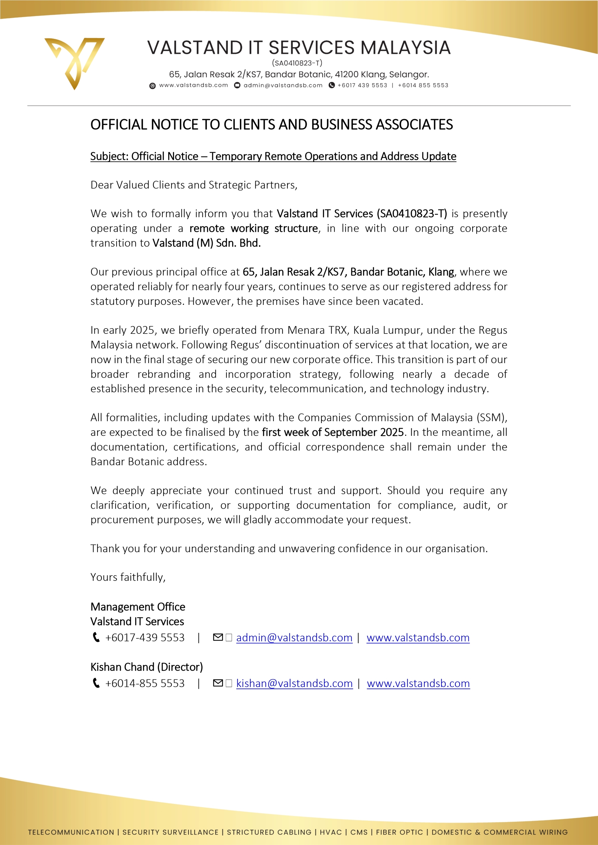As part of our corporate transition to Valstand (M) Sdn. Bhd., we are currently operating remotely while finalising our new office premises. Please refer to the official notice below for full details on our registered address and operational structure during this interim period.
